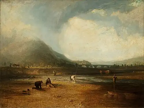 The Trout Stream is an 1809 landscape painting by the British artist J.M.W. Turner. [1] [2] It depicts a view of the River Dee in North Wales with anglers fishing trout. it was displayed at Turner's own gallery in Queen Anne Street in Marylebone rather than at the Royal Academy's Summer Exhibition at Somerset House. It was purchased by Earl of Essex for his country estate of Cassiobury Park in Hertfordshire. Today it is in the Taft Museum of Art in Cincinnati in Ohio. [3]