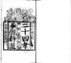 The Twenty-four Filial Exemplars, also translated as The Twenty-four Paragons of Filial Piety (Chinese: 二十四孝), is a classic text of Confucian filial piety written by Guo Jujing (郭居敬)[1] during the Yuan dynasty (1260–1368). The text was extremely influential in the medieval Far East and was used to teach Confucian moral values.