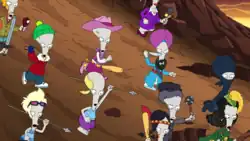 While in the cage awaiting their fate, Stan reveals his next tattoo, the phrase "See ya, Wouldn't Wanna Be Ya!" which is the final thing Stan says to his family before he goes to South America, and the final thing he says to them before the blast. Hayley and Steve show up and capture Lewis, but they are unable to free the three from their cage, who are now also dangling off of a cliff. Francine then shows up and uses the muscle she gained from the trash day experience to help free Stan and then Roger and Greg, and the family all reconcile, but are soon surrounded by all the other survivors of the blast. Just then, "The Two Hundred" arrive to attack, and they are revealed to be Roger's 200 previous personas. Roger flashes back to a moment when he wandered into a "hadron collider" and unintentionally creates 200 clones of himself. Jeff shows up riding a dragon version of Klaus and destroys the 200 Rogers, a time-skip occurs and Stan tells his grandchildren about the event, ending on the moral that Roger should never be trusted on his lonesome.