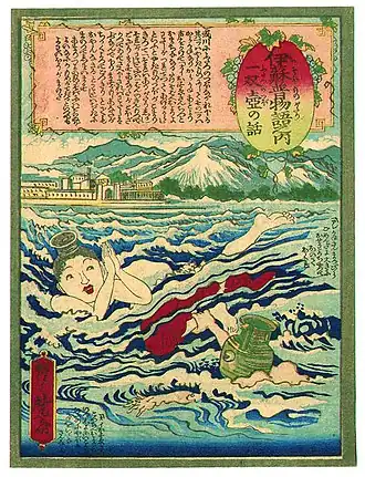 Book illustrations of Aesop's fable inevitably picture two contrasting pots being carried along a river. In the lively woodblock print by the Japanese artist Kawanabe Kyosai, the pots are given human forms and shown tossed on the waves of a heavy sea. There the earthen pot is desperately fending off the friendly approach of the metal pot. In the distance is a town with mountains behind it. How much Kyosai has added is plain when one compares his version with the one by John Tenniel on which it is based. The gated town in the background is almost identical, but Tenniel shows the two pots becalmed in an eddy near the mouth of an estuary.[7] This in turn looks back to the various illustrations in Alciato's Book of Emblems, especially that of the 1591 edition. There the pots are tossed on waves as they are carried towards the sea; in the background are mountains with a town at their foot and a castle perched on a height.[8]