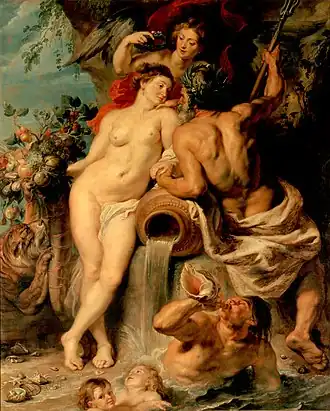 The Union of Earth and Water is a Baroque painting by Flemish artist Peter Paul Rubens, showing Cybele as the personification of earth holding the horn of plenty and [the River God Scheldt] as the personification of water in the center. [1] The pair is crowned by the goddess Victoria and the union is heralded through a conch by the Triton below.[1] The union symbolizes fertility, wealth and prosperity, specifically the city of Antwerp and the river Scheldt whose mouth in Rubens' times was blocked by the Dutch depriving Flanders of the access to the sea.[1] The painting features a pyramidal composition, symmetry and the balance of forms. It was influenced by late Italian Renaissance, particularly by Venetian artists.[1]