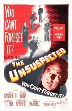 The Unsuspected is a 1947 American mystery film noir directed by Michael Curtiz and starring Claude Rains, Audrey Totter, Ted North, Constance Bennett, Joan Caulfield, and Hurd Hatfield. The film was based on the 1946 novel of the same title by Charlotte Armstrong.[3] The screenplay was co-written by Bess Meredyth, who was married to director Curtiz.