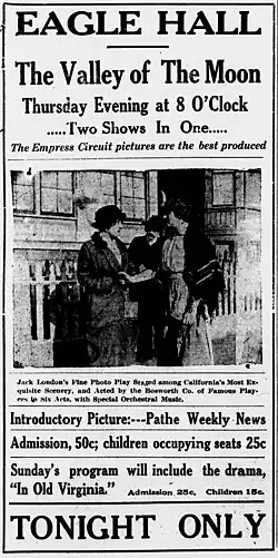 The Valley of the Moon is a 1914 silent film directed by Hobart Bosworth and starring Jack Conway and Myrtle Stedman. Produced by Bosworth/London,[2] it was an adaptation of the 1913 novel The Valley of the Moon by Jack London[3] and based upon a scenario by Hettie Gray Baker.[4]