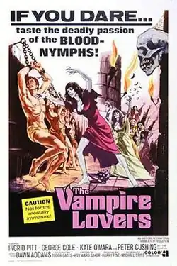 The Vampire Lovers is a 1970 British Gothic horror film directed by Roy Ward Baker and starring Ingrid Pitt, Peter Cushing, George Cole, Kate O'Mara, Madeline Smith, Dawn Addams, Douglas Wilmer and Jon Finch.[2] It was produced by Hammer Film Productions. It is based on the 1872 Sheridan Le Fanu novella Carmilla and is the first film in the Karnstein Trilogy, the other two films being Lust for a Vampire (1971) and Twins of Evil (1971). The three films were somewhat daring for the time in explicitly depicting lesbian themes.