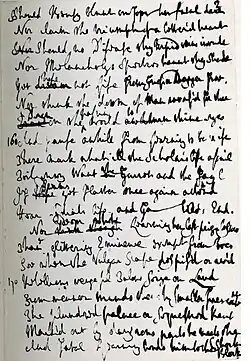 In a conversation with George Steevens, Johnson recounted that he wrote the first seventy lines "in the course of one morning, in that small house behind the church".[7] Johnson claimed that "The whole number was composed before I committed a single couplet to writing".[8] To accomplish this feat, Johnson relied on a "nearly oral form of composition" which was only possible "because of his extraordinary memory".[8] Johnson told Boswell that when he was writing poetry, he often "from laziness" only wrote down the first half of each line.[9] This remark is borne out by the manuscript of The Vanity of Human Wishes, in which the first half of each line is written in a different ink to the second half; "evidently Johnson knew that the rime words would keep the second halves in mind."[10] Although Johnson was busy after 1746 working on his Dictionary, he found time to further work on The Vanity of Human Wishes and complete his play, Irene.[11]