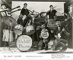 The group originated from a jam session between Randy "Jimmie James" Bowles (lead guitar, vocals) and Chuck Funk (rhythm guitar) in 1965. Funk recommended rehearsing with neighbor George Radford (saxophone) at his parents' upholstery shop, with the resulting session encouraging the trio to form a band Randy Bowles named the Illusions.[1] Radford's father elected to manage the group, supplying them with Vox equipment and velvet outfits. Upon discovering that another band was known as the Illusions, the band changed their moniker to the Velvet Illusions to emphasize their unusual gimmick. The band added to their personnel when they recruited Steve Weed (keyboards, vocals), formerly of the local group the Shy Guys, Larry "Lurch" Linse (bass guitar), and Danny Wagner (drums).[2]