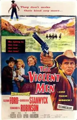 The Violent Men is a 1955 American CinemaScope Western film directed by Rudolph Maté and starring Glenn Ford, Barbara Stanwyck, Edward G. Robinson, Dianne Foster, Brian Keith, and May Wynn.[3][4][1][5] Based on the 1955 novel Smoky Valley by Donald Hamilton,[6][4] its storyline involves a ranch owner who comes into conflict with the land grabbing tactics of the big local rancher, whose tense marriage threatens his family's stranglehold over the region.