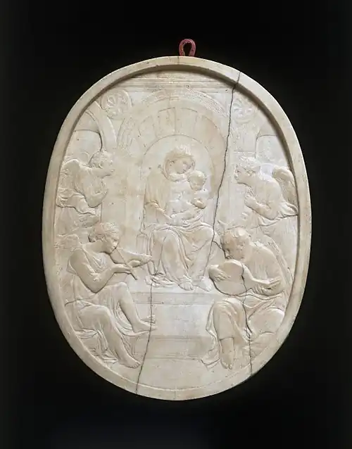 The Virgin and Child is a c.1426 stiacciato marble relief produced by a pupil or studio assistant of the Italian Renaissance sculptor Donatello, probably after a drawing or autograph sculpture by the master himself. It is sometimes known as the Hildburgh Madonna after Dr. Walter Leo Hildburgh FSA, who in 1956 donated it to its present owner the Victoria and Albert Museum in London.[1] It is dated to 1426 by comparison to Masaccio's Madonna and Child, produced that year and from which it draws its details of its composition.[2][3]