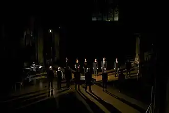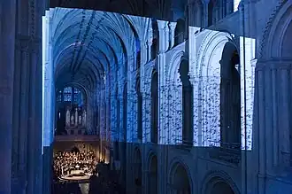 This site-responsive piece took place in Norwich Cathedral on 23 January 2017 – making extensive use of the space in a carefully choreographed promenade performance. The seating was removed from the nave to allow the performers to move freely throughout the space and to increase the effect of the lighting design.[19][12]