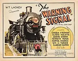 The Warning Signal is a 1926 American silent action drama film directed by Charles J. Hunt and starring Gladys Hulette, Lincoln Stedman and Clarence Burton.[1]