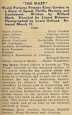 The Wasp is a lost[1] 1918 silent film comedy drama directed by Lionel Belmore and starring stage star Kitty Gordon. It was produced by William A. Brady and distributed by World Film Company.[2]