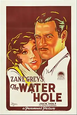 The Water Hole is a 1928 American silent Western film directed by F. Richard Jones starring Jack Holt, Nancy Carroll, and John Boles It was based on a novel by Zane Grey and released by Paramount Pictures. The film had sequences filmed in Technicolor, and it was shot during July in Death Valley, California.[1] No copies of The Water Hole are known to exist, suggesting that it is a lost film.[1]
