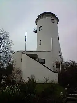 The Water Tower is a building in Kenilworth, Warwickshire, England. It is understood that the building was constructed as a windmill in the mid-18th century by Joseph Lee of Warwick, described as Gentlemen and John Lamb of Warwick, Haberdasher. There is evidence of a sale in 1778 of the Mill as a going concern. The building continued to be used as a working windmill until 1854 when steam power was introduced. In 1885 the mill machinery was removed and the building converted into a water tower.[1] This involved the doubling of the height of the brickwork and surmounting it with a 26,000-gallon iron tank. This became the town's first Waterworks and provided most of Kenilworth's water supply until 1939. The supply from this tank was in fact in use for auxiliary purposes until approximately 1964. In 1970 Kenilworth Urban District Council, anxious to ensure the preservation of such an important and historic landmark, offered it for sale by tender on condition that it should be sympathetically restored and converted for use as a private dwelling house. Plans submitted by the architect, Mr Edward Byron of Leamington Spa, on behalf of Lt Col Michael Wheat, were accepted and a conversion was commenced in late 1972 and completed in 1974. This imaginative conversion incorporates a new ground floor extension cleverly designed to harmonise with the character. The tower and the whole now forms a unique and comfortable home successfully linking the past with the present.