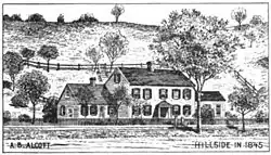 Shortly after the failure of the Fruitlands experiment, educator and philosopher Amos Bronson Alcott and his family moved to Concord.[2] Beginning in October 1844, the family first lived in the home of a friend named Edmund Hosmer. Alcott's wife Abby May had recently inherited about $2,000 and they intended to use the money to buy a home.[3] Neighbor Ralph Waldo Emerson helped the family find the property to buy: a home most recently owned by a wheelwright named Horatio Cogswell.[4] Emerson also loaned the family $500 for their purchase.[5] Bronson took no part in the transaction being, as his wife explained, "dissatisfied with the whole property arrangement" and did not believe he could own any part of the Earth.[6] No one seemed to know much about the history of the home, though Henry David Thoreau told the story that one of its previous owners believed he would never die and his ghost was rumored to haunt it.[7] The Alcotts moved in on April 1, 1845;[7] they named the home "Hillside".