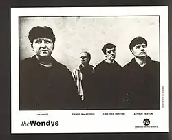 Formed in 1987, the Wendys were the second Scottish band to be signed to Factory Records, after the Wake. Their name came about after a nights drinking in the Blues Basement (now the Basenment) the evening before they were due to play their first show in an apartment in Claremont Crescent Edinburgh. After the group opened for the Happy Mondays, Shaun Ryder's father suggested that they send in a demo tape.[1] After they were signed to the label, Phil Saxe acted as their manager. Having felt at odds with the contemporary Scottish music scene, the Wendys found a common spirit among the Factory Records roster, saying they shared similar influences as their labelmates but still wanted to be known as their own distinct band.[2] Although they enjoyed critical acclaim with the release of their debut album Gobbledygook in 1991 (produced by Ian Broudie), they did not achieve the widespread popularity of labelmates such as New Order or the Happy Mondays. The timing of their album's release directly preceded the demise of the label, also hurting their chances at success. Following a long hiatus, the group released their second album Sixfootwingspan (originally intended to be called Sixfootwingspan Yoga Birds) in 1999.