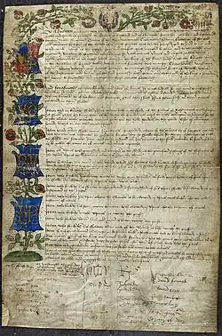 The manuscript appears to have been displayed at the tournament and signed on two days.[8] In the original spelling, for the first day: Henry R; Rychard de Gray; Thomas Cheyney; William Par; Robert Morton; Richard Blunt; Thomas Tyrell; Sir Rowland; Cristoffer Wyloughby (son of Christopher Willoughby, 10th Baron Willoughby de Eresby).