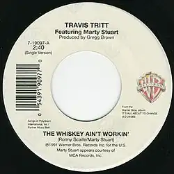 "The Whiskey Ain't Workin'" is a song recorded by American country music artists Travis Tritt and Marty Stuart. It was released in November 1991 as the third single from Tritt's album It's All About to Change. It peaked at number two on the Billboard country music chart in the United States,[1] and at number four on the country singles chart in Canada. The song was written by Stuart and Ronny Scaife.