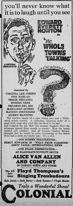 The Whole Town's Talking is a 1926 American silent romantic comedy film directed by Edward Laemmle and starring Edward Everett Horton, Virginia Lee Corbin, and Trixie Friganza. It is based on a play by Anita Loos and John Emerson, which in turn is based on a play by Franz Arnold and Ernst Bach.[1][2]