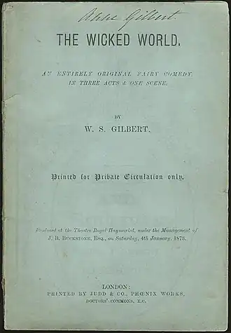 The Wicked World is a blank verse play by W. S. Gilbert in three acts. It opened at the Haymarket Theatre on 4 January 1873 and ran for a successful 145 performances, closing on 21 June 1873.[1] The play is an allegory loosely based on a short illustrated story of the same title by Gilbert, written in 1871 and published in Tom Hood's Comic Annual, about how pure fairies cope with a sudden introduction to them of "mortal love."