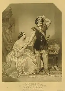 The Wife's Secret is an 1846 historical play by the British writer George William Lovell. The play takes place in Dorset during the rule of Oliver Cromwell after the English Civil War. It premiered at the Park Theatre in Manhattan on 12 October 1846 with Charles Kean in the lead. It made its London debut at the Theatre Royal, Haymarket on 17 January 1848.[1] The Haymarket cast included Charles Kean as Sir Walter Aymott, Henry Howe as Lord Arden, Ellen Kean as Lady Eveline Amyott, Benjamin Nottingham Webster as Jabez Sneed and Mary Anne Keeley as Maud. The Times praised Ellen Kean's performance, noting "the wife, is played to perfection".[2]
