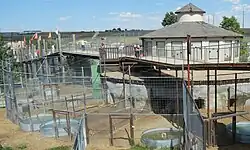 The sanctuary aims to eventually get all of their animals into large acreage habitats. It designed with a central compound for receiving new animals and starting their recuperation and acclimation into these larger habitats.[11] The lower floor of the main compound houses tigers, and the upper floor is an education center.[12] The animals in this area have indoor/outdoor enclosures with play structures, and heated areas for the winter. The common pool area where tigers can take turns playing includes a waterfall.[13]