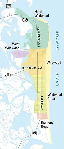 The Wildwoods are a group of five communities (four distinct municipalities and one census-designated place) in Cape May County, New Jersey. These are situated on the Island of Five Mile Beach, a barrier island facing the Atlantic Ocean. These Jersey Shore communities have relatively small year-round populations that swell significantly during the summer with vacationers.[1]