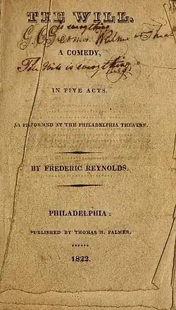 The Will is a 1797 comedy play by the British writer Frederick Reynolds. It premiered at the Theatre Royal, Drury Lane in London on 19 April 1797.[1] The original cast included Thomas King as Sir Solomon Cynic, Richard Wroughton as Mandeville, John Bannister as Howard, Robert Palmer as Veritas, Richard Suett as Realize, Samuel Thomas Russell as Robert, John Hayman Packer as Old Copsley, Dorothea Jordan as Albina Mandeville, Charlotte Tidswell as Deborah, Ursula Booth as Mrs Rigid and Harriet Mellon as Cicely Copsley.[2] The Irish premiere took place at Dublin's Crow Street Theatre on 16 December 1799.[3]