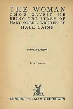 - ^ Caine, Hall (1913), The Woman Thou Gavest Me, London: Heinemann, Part III, Chapter 49