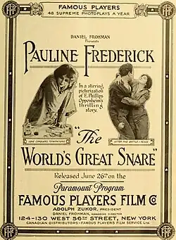 The World's Great Snare is a 1916 American silent drama film produced by Adolph Zukor's Famous Players Film Company and distributed through Paramount Pictures. The film is based on a 1900 novel of the same name by E. Phillips Oppenheim and was directed by Joseph Kaufman. The film stars Pauline Frederick, a noted stage actress, and Irving Cummings, later a director, is the male lead.[1] The film is now considered lost.[2]