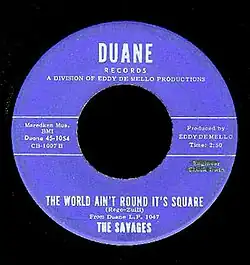 "The World Ain't Round It's Square" was written by Howie Rego and Bobby Zuill and performed by the Savages from Bermuda.[2][3] The Savages were formed in 1965.[2][3] Their membership consisted of Paul Muggleton and Jimmy O'Connor on guitar, Zuill, on bass, and Rego, on drums.[2] Muggleton usually handled lead vocals, but Zuill sang lead on "The World Ain't Round, It's Square."[4] The band were able to gain a residence at the Hub, a nightclub at the Princess Hotel, sometimes doing as many a three gigs a day, often for American college students on vacation.[2][4] They signed a recording contract with the Duane label, run by Eddie DeMello, who would also manage the band and produce their material.[2]