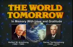 The World Tomorrow is a half-hour radio and television program which was sponsored by the Worldwide Church of God (originally known as the Radio Church of God) led by Herbert W. Armstrong. It originally ran from 1934 to 1994.[1] A 15-minute version of the radio program (under varied translations of The World Tomorrow) was broadcast in the French, German, Italian, Russian, and Spanish languages.