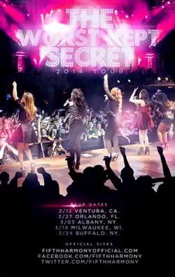 The Worst Kept Secret Tour was the second official tour from American girl group Fifth Harmony and the third overall. It began in Ventura, California on February 2, 2014 and ended on March 24, 2014 in Buffalo, New York. The group performed in the tour around the same time when they were opening acts for Demi Lovato's Neon Lights Tour. The official poster for the tour was chosen by Fifth Harmony among many nominations submitted by fans. It was planned as an early tour for fans who were going to see the group in the Neon Lights Tour.[1]