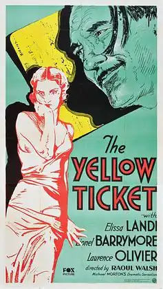 The Yellow Ticket is a 1931 pre-Code American drama film based on the 1914 play of the same name by Michael Morton, produced by the Fox Film Corporation, directed by Raoul Walsh, and starring Elissa Landi, Lionel Barrymore and Laurence Olivier. Boris Karloff appears briefly in a small supporting role. The picture is also a noteworthy example of productions from the pre-Code era in that it includes brief nudity.