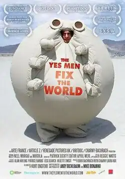 The Yes Men Fix the World is a 2009 documentary film about the culture jamming exploits of The Yes Men. The film premiered in New York City and Los Angeles on October 23, 2009, and in other U.S. cities beginning on October 30. Due to the movie being sued by United States Chamber of Commerce, a special edition of the movie is distributed through bittorrent through VODO and other prominent torrent sites like The Pirate Bay and EZTV.[1][2]