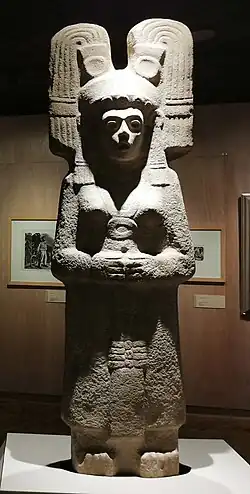 The sculpture is estimated to have been created between 1450 and 1521, during the postclassic period. It is a 2-meter (6 ft 7 in) tall, 60-centimeter (24 in) wide, and 25-centimeter (9.8 in) thick limestone artwork that depicts a woman wearing a blouse and ankle-length skirt.[3][4] She appears to wear jewelry, including circular pendants known as "oyohualli".[3] Her eyes are hollow indicating that they probably had stones in them.[4] At her bare feet,[4] there is a stake that allowed the sculpture to be placed in the ground upright.[3]