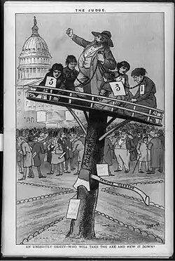The twin relics of barbarism refer to the popular nineteenth-century phrase that linked the practices of slavery and polygamy in the United States. Attention to these twin relics increased following the 1856 Republican National Convention as the party acknowledged both practices in their party platform. Within the party's planks, they called on Congress to firmly denounce the "twin relics of barbarism – Polygamy and Slavery."[1] During this period, slavery was widely practiced among southern states, and polygamy was becoming prevalent among members of the Church of Jesus Christ of Latter-day Saints (popularly referred to as Mormons). The growth of these practices stoked fear and uncertainty in the nation at large as the two practices were seen as "incongruous with the pure and the free, the just and safe principles inaugurated by the [American] Revolution."[2] As a result of the widespread opposition to each, they were increasingly coupled together in national print media throughout the country.