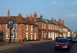 Theale before the 20th century was an early example of ribbon development, in that the built-up area was a long strip along the Bath Road with no side streets. The layout focuses on the crossroads formed by the High Street (east), Church Street (west), Blossom Lane (north) and Station Road (south). The High Street is completely built up with mainly Victorian edifices in red brick, some in patterned brickwork and some rendered in lime plaster. It is a conservation area. Listed buildings earlier in date are 1, 4, 29, 31, 33, 35, 37, 43–5, 47, 48, 49, 50, 52, 58, 60.[33] Of these, seventeenth-century timber framed buildings are 29, 33, 35 and 52; the others are Georgian or Regency. 29, 31 and 47 are old coaching inns (31 still open as The Falcon). 49 has an unusual Gothic door-case.[34]