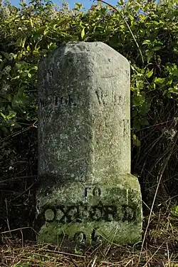 Before the 20th century,[37] Blossoms Lane ran to a hamlet called Blossoms End and ended at Blossomsend Farm, now a golf course. The road is now Crown Lane, leading to Blossom Lane. The High Street conservation area includes Crown Lane and lower Blossom Lane, protecting Victorian houses with polychrome brickwork. Station Road leads through the industrial and commercial area, under the 1971 bypass bridge to the railway station, then on to the swing bridge over the canal at the Sheffield Bridge conservation area. This contains Sheffield Mill, Sheffield Lock and a pillbox, all listed. This lock has unusual scalloped walls. Garston Lock, to the east is Grade II* listed because it is a very rare turf-sided lock. The parish boundary is at the bridge, although the Fox and Hounds pub at Sheffield Bottom further on has a Theale postal address. The smallest listed building in Theale is on the A340 just south of the Bradfield Road crossroads. It is an 18th-century milestone in the form of a short column, reading "TO BASINGSTOKE 15; TO WALLINGFORD 13; TO OXFORD 26".[38]