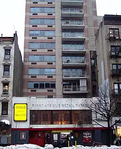 The renovation of Theater for the New City came at a great cost to its relationship with the community in 2000 when Mayor Rudolph Giuliani sold the air rights above the theater (which the city had retained) to a developer. TNC was at that time in default of a loan borrowed against a pledged grant from the Manhattan Borough President's Office, which never materialized. The City put a lien against TNC in 1997 and unable to find a major donor to pay off the $519,634 lien, TNC was forced to agree to the construction of a 12-story tower above their space in order to have the lien forgiven.[16] The deal included an extension on the theater's mortgage and gave the theater a seat on the condo's board. Being taller than the 6-story tenement buildings prevalent on the Lower East Side, the condo tower was seen as a threat to the character of the neighborhood and construction in 2000 took place amidst protest.[17] The tower became even more of a controversy when the developer hired non-union workers to build the tower.[18]