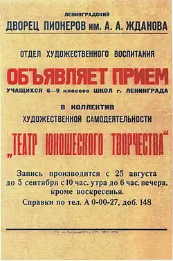 Theater of Youth Creativity (Russian: Театр Юношеского Творчества) (TYUT for short) - youth theatre school in Leningrad was founded by Matvey Dubrovin in 1956.