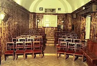 Theater of Youth Creativity was built on the principle of Matvey Dubrovin Circle.[2] In contrast to the professional theater, which was built as a hierarchical ladder, where at the top are the director and the actors, and at the bottom theater departments such as: costume designers, make-up, props, lights, etc. Matvey Dubrovin has created round table, where all the theatrical professions are equally important, and performance is the result of community labor. Each participant chooses his own theater production workshop and works in it, contributing to the creation of the performance. This arrangement, where each of the participants learns all of the aspects of theater production, largely protects the young actors from «star» disease (i.e. today you are an actor, but tomorrow you are behind the scenes, working in one of the workshops, helping your friends). Originally TYUT had 10 theatrical departments: