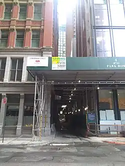Theatre Alley is a block-long cobblestone alley in the Financial District of Manhattan, New York City, between Ann and Beekman Streets.[1] It is one of Manhattan's few alleys that is not privately owned, and prior to the expansion of 5 Beekman Street adjacent to the alley c. 2010, it was "dank and claustrophobic".[2]