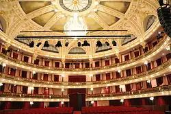 The interior is highlighted by decorative elements that fill the spaces, such as columns, the decoration on the walls, floors and the organization of the ceilings.[1] The auditorium stresses the grandiosity of the space, the rhythmic organization of the balconies, which are highly decorated, in Neo-Baroque elements.[1]