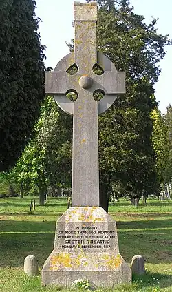 The theatre is best remembered for the disaster during a dramatisation of Romany Rye (a melodrama by Wilson Barrett) on 5 September 1887, which became the worst theatre fire in British history. Fire broke out backstage where gas lighting ignited some gauze. The number of exits from the gallery of the auditorium proved to be inadequate and in the resultant panic amongst the audience 186 people died.[5] A national appeal for donations for the victims’ families raised £20,763 and the event was influential in the introduction of safety precautions for public buildings.[6] There is a memorial to those who died in the fire in Higher Cemetery, Heavitree, made by local sculptor Harry Hems.[7]