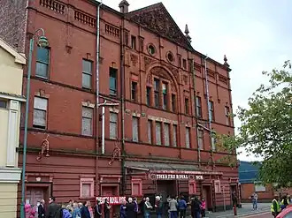 Planning permission was granted by the local council to build a licensed theatre to replace the Theatre Royal of nearby Frank Street in 1901.[1] The theatre was designed by Campbell and Horsley of Manchester and built by S. Robinson and Sons of Hyde. The completed theatre opened on 3 November 1902 with a Victorian French melodrama, Little Jim, with Shakespeare and other classic plays to follow.[2] In 1914 a movable screen was added onto the stage to enable the theatre to operate as a part-time cinema.[3]