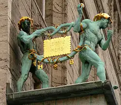 In early 2013, no later than January 21, 2013, the golden Leibniz cookie was stolen from the facade of the headquarters of the cookie manufacturer Bahlsen by thieves who remain unidentified to this day (2023).[1] The stolen item was a gilded brass depiction of a Leibniz cookie, weighing around 20 kilograms, created by the sculptor Georg Herting around 1910, along with the pretzel-shaped figures known as the Brezelmänner (Pretzel Men). Shortly after the theft, the Hannoversche Allgemeine Zeitung and Bahlsen received a ransom note. The note, which included a photo of an unidentified person dressed in a Cookie Monster costume posing with the cookie, demanded that Bahlsen donate chocolate cookies to the children's hospital auf der Bult and the €1,000 reward to an animal shelter in Langenhagen. Otherwise, the note threatened, the golden cookie would be sent "to Oscar in the trash can."[2][3]