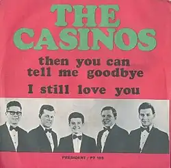 The Casinos version of "Then You Can Tell Me Goodbye" - which became the title track of the group's debut album - reached number 6 on the U.S. Billboard Hot 100 in March 1967,[3] becoming the group's only Top 40 hit. Casinos' frontman Gene Hughes would recall that he'd heard the 1964 Johnny Nash recording of "Then You Can Tell Me Goodbye" on the John R. Show broadcast on WLAC out of Nashville and that the Casinos had been performing it in their club act for several years (Gene Hughes quote:)"So, while we were in the studio in the King Studios in Cincinnati, cutting this instrumental [King Curtis’] ‘Soul Serenade’ for a disk jockey, we used the time to [also] cut ‘Then You Can Tell Me'."[4] Musicians on the track included Bob Armstrong on organ, Mickey Denton on guitar, Ray White on bass, and Bob Smith on drums. The track also featured a brass section of trumpets and trombones.[5] It was also a number 28 pop hit in the United Kingdom.[6]