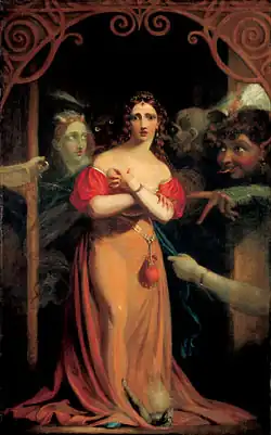 Like Fuseli, von Holst painted mostly famous literary subjects of European culture, but not current trends. He drew from the works of Virgil, Dante, William Shakespeare, Mary Shelley, and Victor Hugo. Von Holst was the first artist to illustrate Shelley's novel Frankenstein in 1831.[2] However, the German Romantics, particularly the works of Goethe, E. T. A. Hoffmann, and Friedrich de la Motte Fouqué, were the basis of almost half his works.[2] Von Holst became "the most prolific English illustrator of German Romance".[2] As Browne explains, "while [von Holst's] exceptional imagination and draughtsmanship were widely praised, his choice of subjects were out of step with the age and public taste. His penchant for the demonic, supernatural, and erotic led to a degree of neglect that was otherwise undeserved."[2]