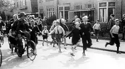 Leo Heaps insisted he wanted to leave the farm since he suspected an upcoming German raid. Dressed in civilian clothing, he was escorted to the river by members of the resistance. In the middle of Tiel, a German stronghold, Heaps's bicycle suffered a flat tire and he had to walk as the other resistance members accompanying him cycled on. When he passed a group of German soldiers, one of them placed a hand on his shoulder to stop him and Heaps dashed off on his bicycle, unharmed, leaving the German patrol to wonder what just happened according to Heaps's own memoir.[36] Upon crossing the river back to safety, Heaps was invited by Airey Neave to join his intelligence outfit IS-9. Heaps was never blamed by Airey Neave for not wearing his uniform during daytime hours despite potentially endangering the Ebbens farm of being shot as a spy. Nor did Heaps and Neave ever mention how the Germans had sent a quisling member of the Abwehr by the name of Johannes Dolron[37] to stay at the Ebbens farm around the time of Heap's departure and near apprehension in early October. Dolron arrived around the time of Heaps's flee for safety and Dolron left the farm after 12 days, only to inform the local German command of the goings on at the farm just prior to the raid.[38]
