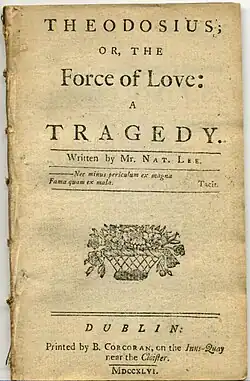 Theodosius; Or, The Force Of Love is a 1680 tragedy by the English writer Nathaniel Lee. It was first staged by the Duke's Company at the Dorset Garden Theatre. It takes place during the reign of the Roman Emperor Theodosius II. Incidental music for the play was composed by Henry Purcell.